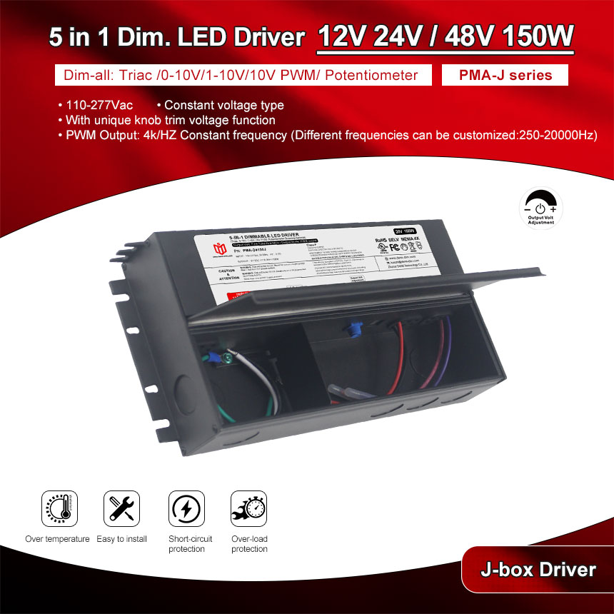 110-277vac input voltage range 150W 5 in 1 dimmable led driver adopts aluminum housing and has an exclusive patented flip-top junction box design. It is easy and quick to install. During installation, it is necessary to install the led driver in a ventilated position to avoid direct contact with the heat source.