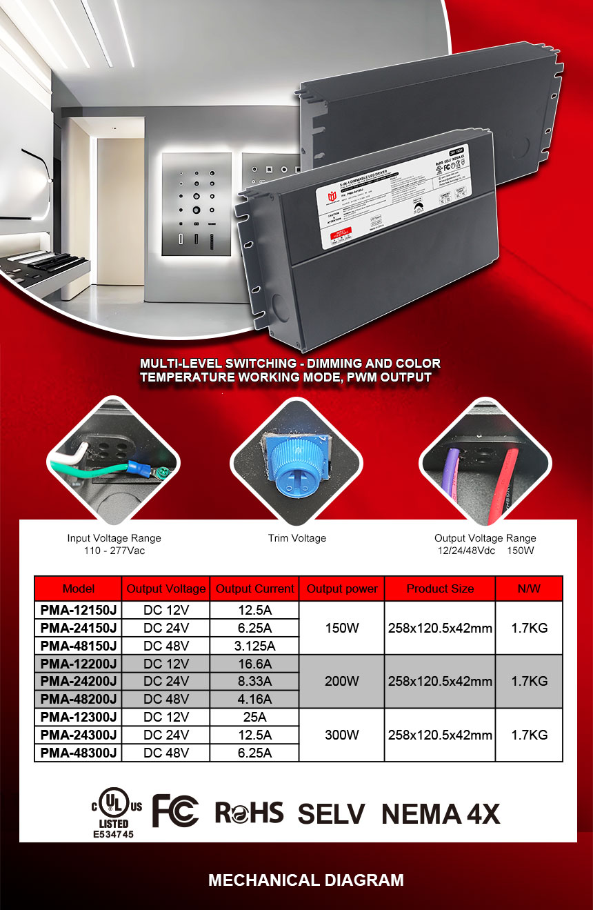 PMA-J | Input | Output | 0/1-10V Dimming | ||||||