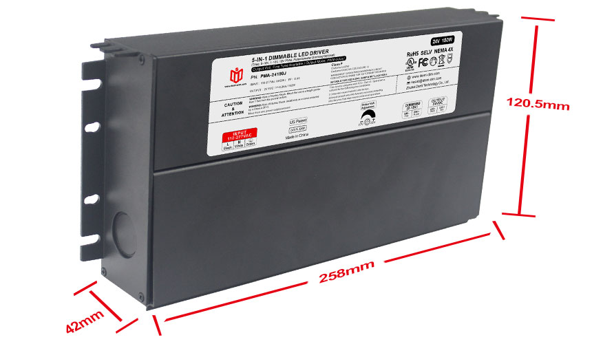 This PMA series 150W 24V dimmable LED driver has a built-in fine-tuning output voltage function knob, and the dimming range is between 0.1-100% ultra-deep dimming. The dimming performance is as good as the 150W dimmable LED driver from Zhenhuan Electronics. With a 5-year warranty